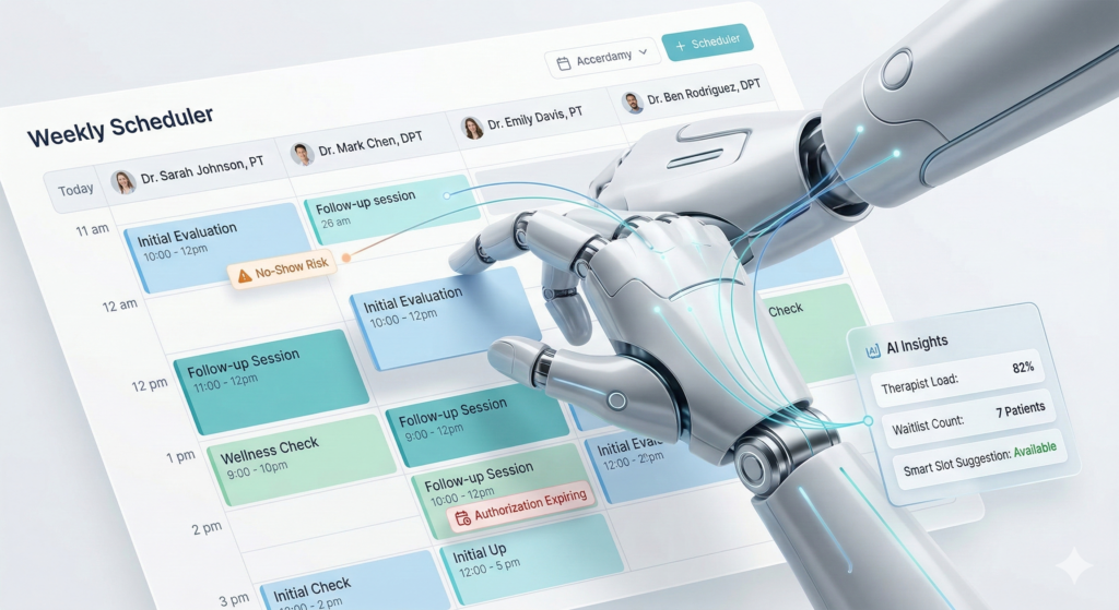 AI-powered physical therapy scheduling software uses intelligent automation to manage patient appointments, therapist availability, and clinic workflows more efficiently. PT Practice Pro scheduling software helps therapy clinics automate appointment booking, reduce scheduling conflicts, and optimize clinic productivity with smart scheduling tools.